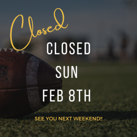 Sunday, February 8th, 2026 CLOSED FOR SUPER BOWL SUNDAY!